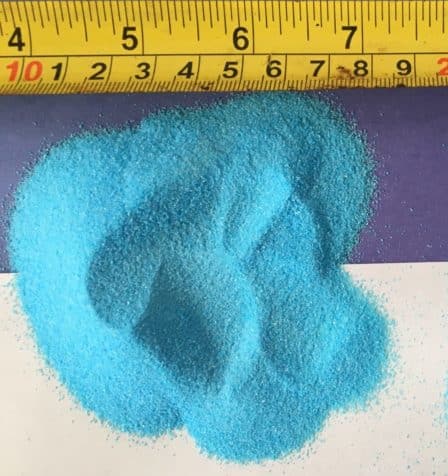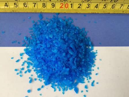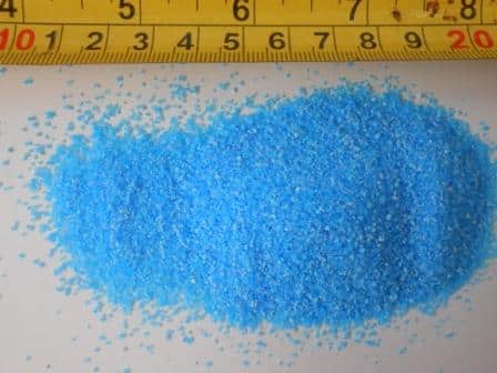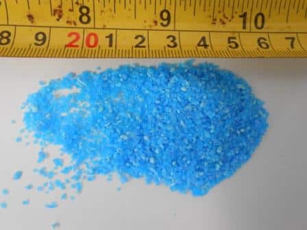 Copper Sulfate powder (Fine 200, Fine 100, Fine 30) contain an anti-caking agent (e.g. Magnesium carbonate, calcium carbonate); larger sizes (Fine 20 – Large) do not. Anti-caking agent creates a film on fine 30 crystals.
